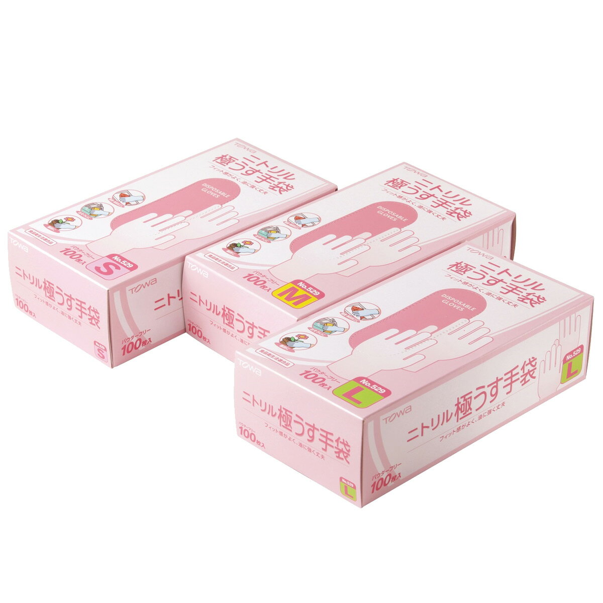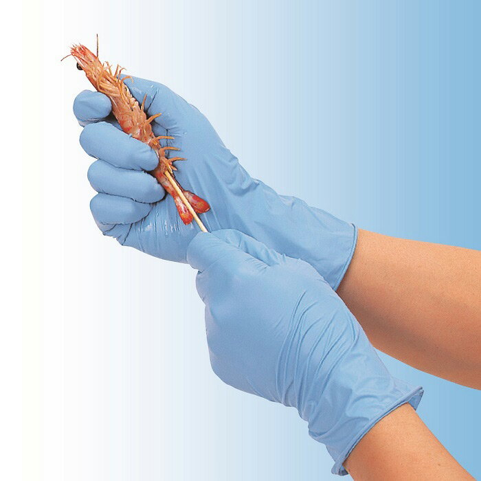 ニトリル極うす手袋 100枚入 サイズはタイトル参照 食品関連作業に適した、軽快に動けるニトリル極うす手袋 特 長 ●他の同タイプのビニル、ゴム手袋に対し、油、薬品に強く、耐摩耗性に優れています。